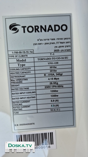 Продаю почти новый портативный кондиционер ( מזגן נייד) TORNADO TO GO 16 EU. 12000 BTU. Не нужен, так как съехали со съемной квартиры. Проработал 3 месяца. Цена 800 шек. ( в магазине 1200 шек)