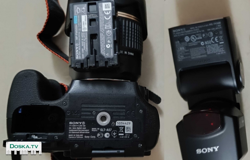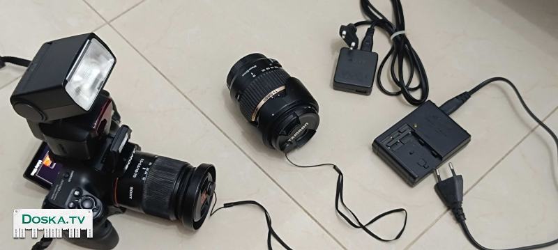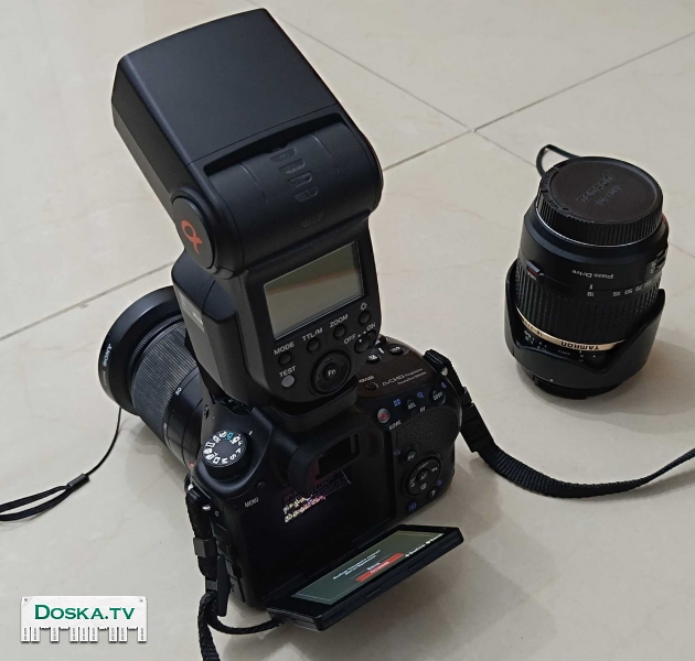 -Плюс отдельная вспышка Sony с оригинальным чехлом к ней . К вспышке имеется добавочный стабилизатор при установке на штатив .