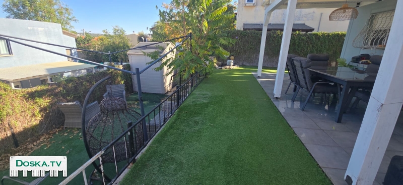 Частный сад с перголой, столом, стульями и махсаном.
